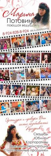 Поющая ведущая Марина Потовина. Организация и проведение праздников для Детей и Взрослых.*юбилеи *свадьбы *корпоративы *выездные регистрации *выпускные *детские тематические дни рождения *все для песочной церемонии и многое другое ok.ru/potovina возможен выезд в города Усолье, Ангарск, Иркутск, Зима , Саянск и все близлежайшие территории.